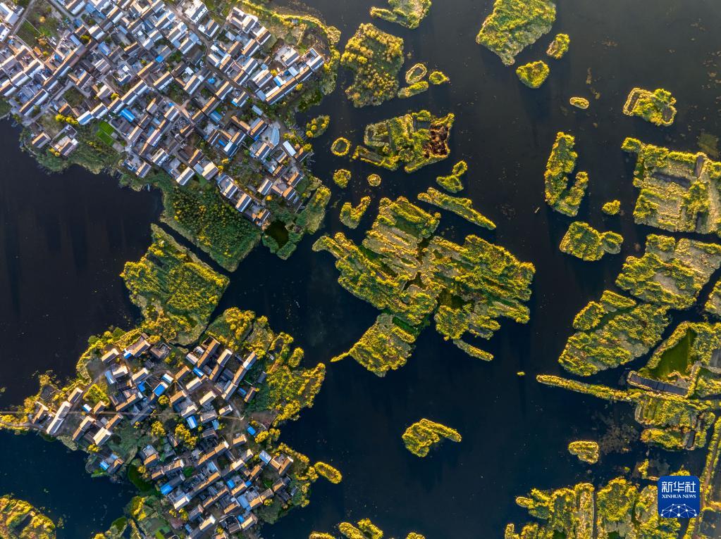 從空中俯瞰西湖國家濕地公園里的村莊及濕地(無(wú)人機照片,10月28日攝)。