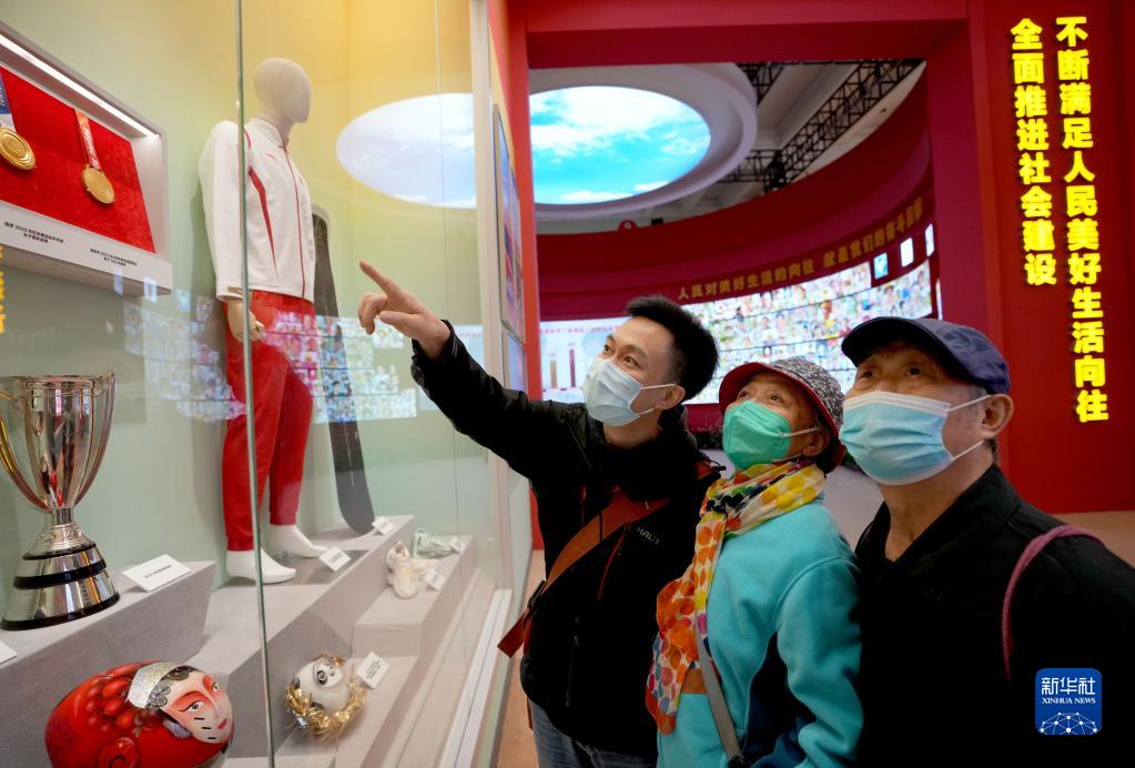 11月4日,來(lái)自北京西城區的李抗美(右)、王昭慧(中)老兩口與兒子一起觀(guān)看有關(guān)北京冬奧會(huì )的展出實(shí)物。為能盡快參觀(guān)“奮進(jìn)新時(shí)代”主題成就展,老兩口讓兒子10月31日零點(diǎn)就上線(xiàn)登記預約。