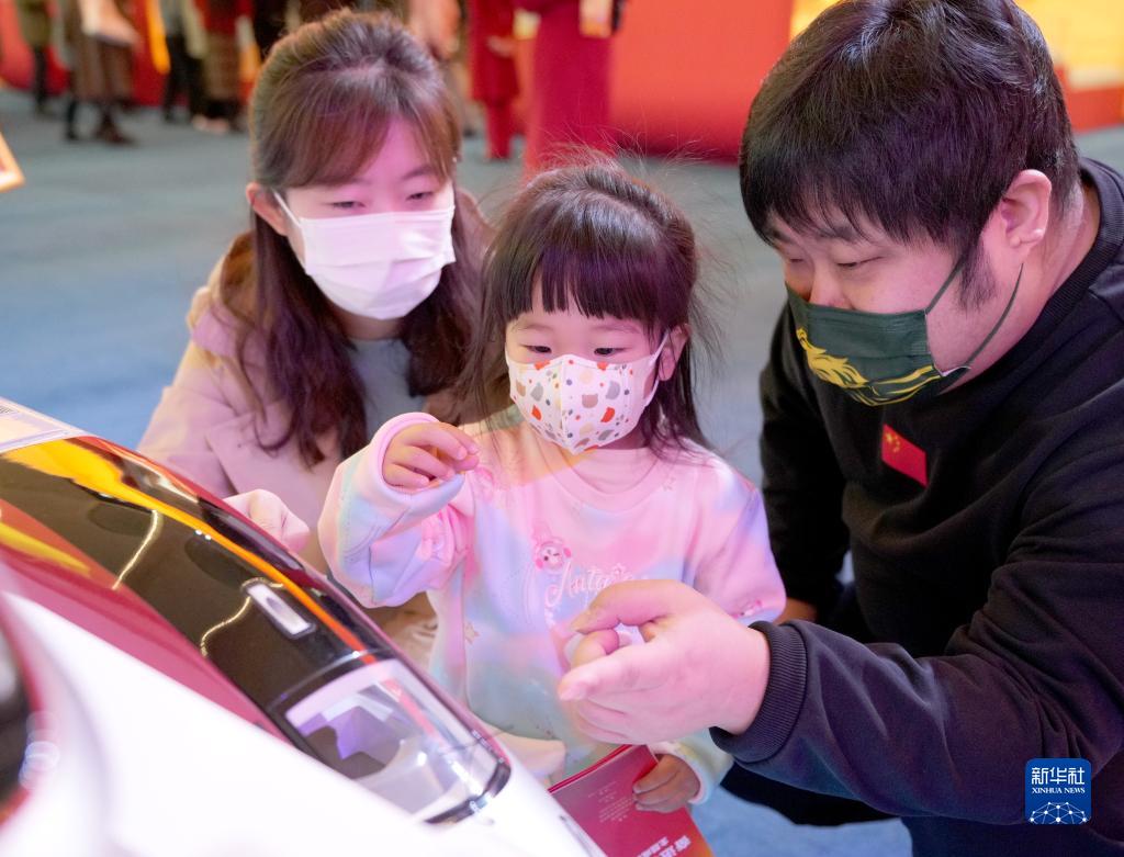 11月4日,年僅2歲半的小觀(guān)眾楊紫凝(中)與父母一起觀(guān)看展覽展出的動(dòng)車(chē)組模型。