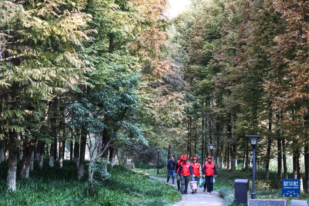 11月4日,在貴州貴陽(yáng),周余慶(右一)與志愿者一起在花溪國家城市濕地公園內巡查。