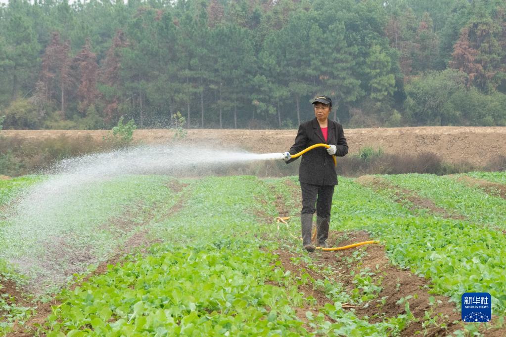11月4日,在湖南省湘潭市湘潭縣中路鋪鎮柳橋村,村民給油菜苗澆水。