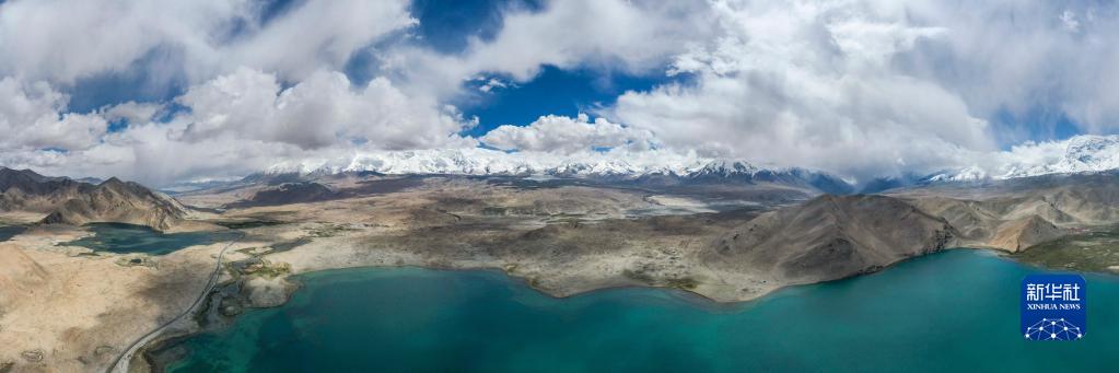 新疆帕米爾高原上公格爾九別峰和慕士塔格峰山腳下的湖泊濕地景觀(guān)(2020年6月16日攝,無(wú)人機全景照片)。