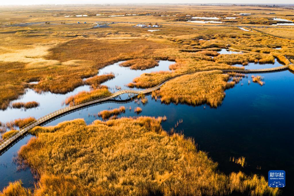 這是10月21日在甘肅省酒泉市肅州區六分濕地公園拍攝的秋景(無(wú)人機照片)。 新華社發(fā)