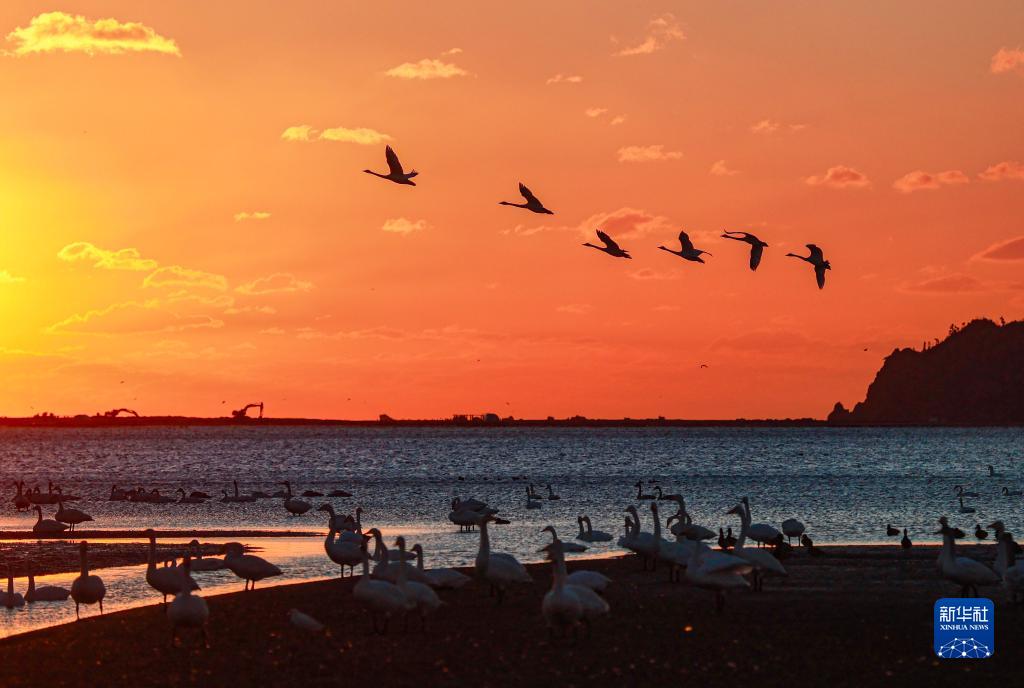 11月4日,山東省榮成市成山鎮天鵝湖濕地,成群的大天鵝在棲息、飛翔。 新華社發(fā)(李信君 攝)
