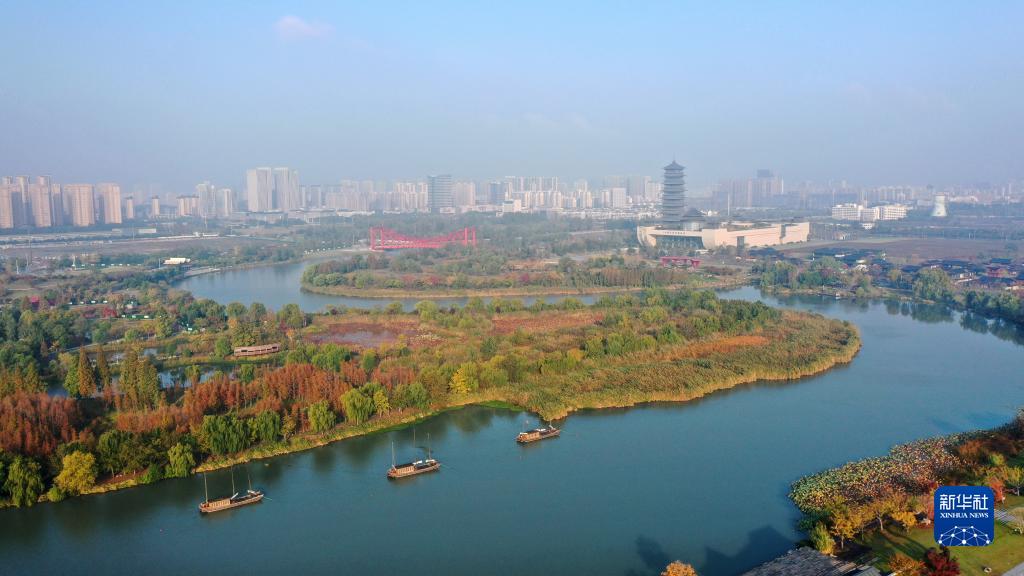 這是11月1日在江蘇省揚州運河三灣濕地公園拍攝的秋景(無(wú)人機照片)。 新華社發(fā)(齊立廣 攝)