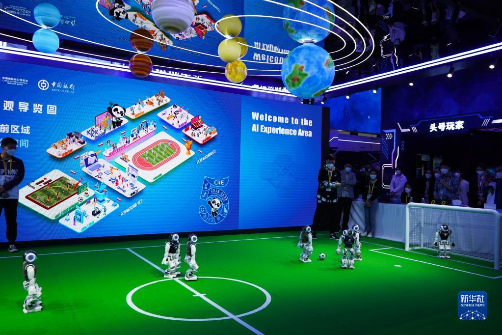 11月5日,參觀(guān)者在第五屆進(jìn)博會(huì )技術(shù)裝備展區人工智能專(zhuān)區觀(guān)看機器人表演。