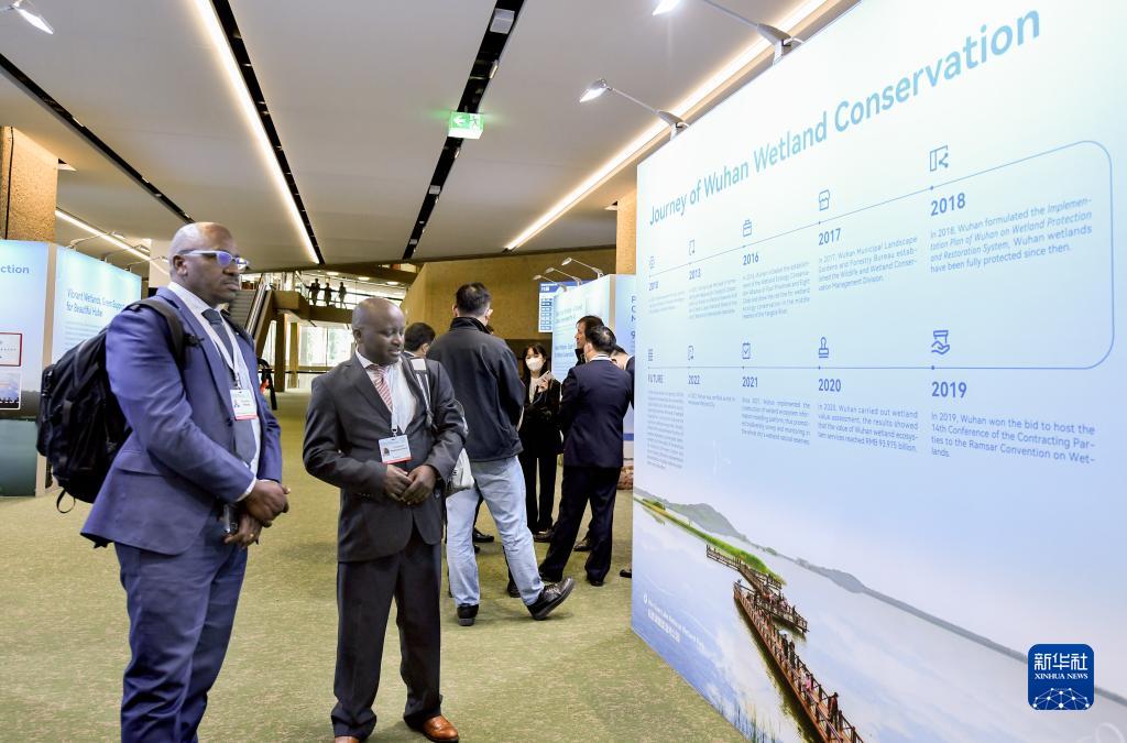 11月5日,在瑞士日內瓦,與會(huì )嘉賓在《濕地公約》第十四屆締約方大會(huì )日內瓦會(huì )場(chǎng)中國展區參觀(guān)。