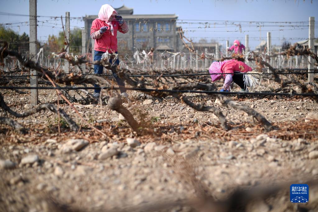 11月5日,在位于寧夏銀川市賀蘭山東麓的藍賽酒莊,農民進(jìn)行埋藤作業(yè)。