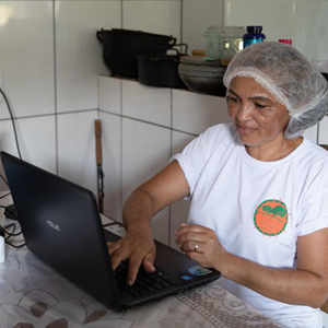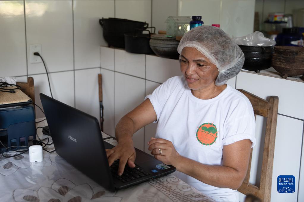 10月4日,在巴西托坎廷斯州馬利亞迪尼亞,水果加工廠(chǎng)工人馬萊娜在家中使用新買(mǎi)的電腦。