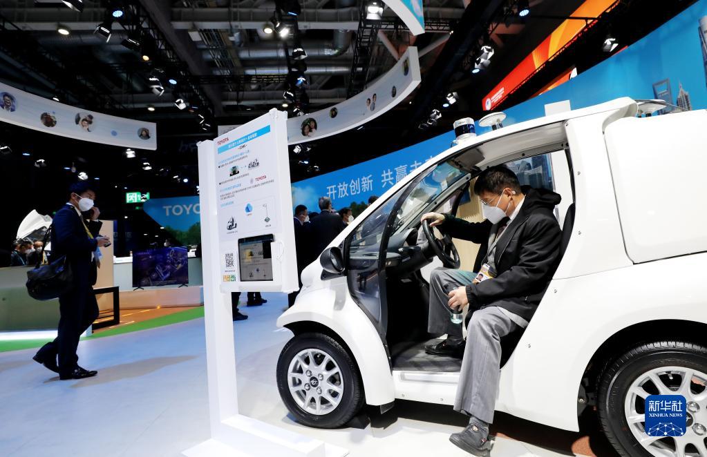 11月6日,參觀(guān)者在第五屆進(jìn)博會(huì )汽車(chē)展區日本豐田汽車(chē)公司展臺體驗具備自動(dòng)駕駛功能的超小型電動(dòng)車(chē)。