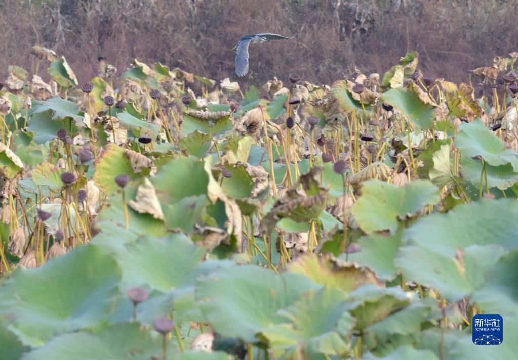 11月5日,一只夜鷺在安徽巢湖半島國家濕地公園內飛翔。