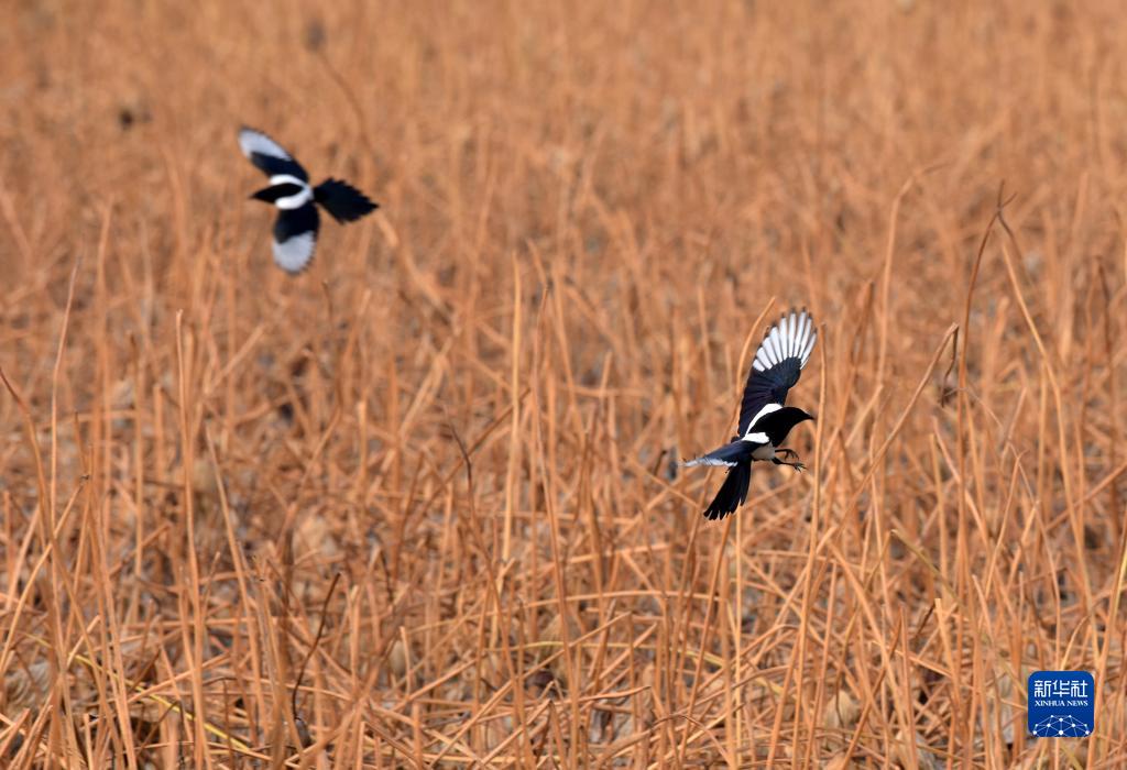 11月5日,喜鵲在安徽巢湖半島國家濕地公園內飛翔。
