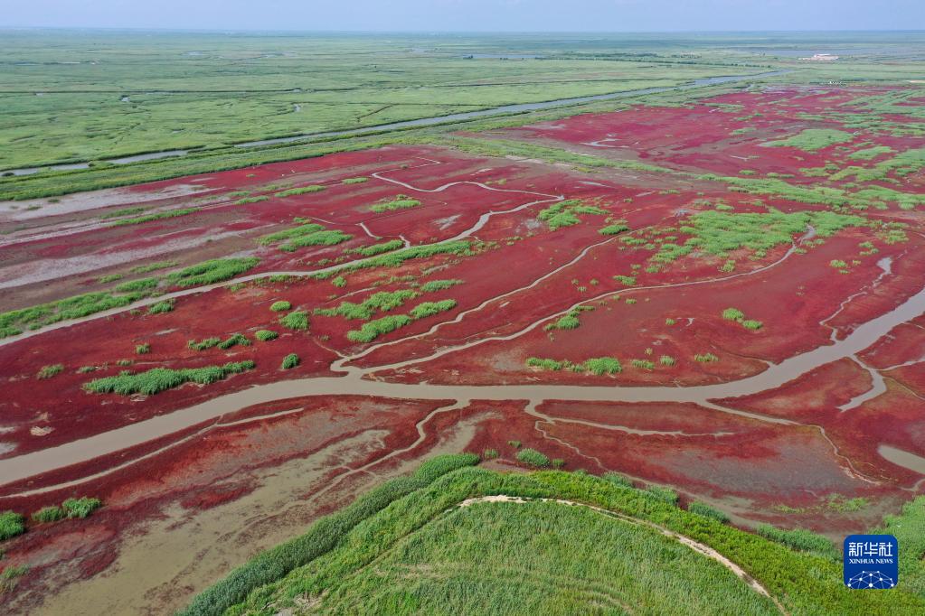 這是遼河入??谂蕴赜械募t海灘(2021年8月19日攝,無(wú)人機照片)。