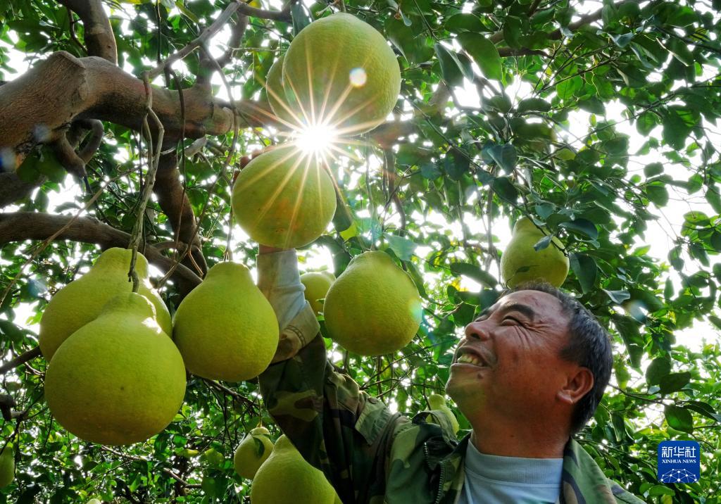11月7日,在廣西融水苗族自治縣國營(yíng)貝江河林場(chǎng)柚子園,一名果農在采摘糯米柚。