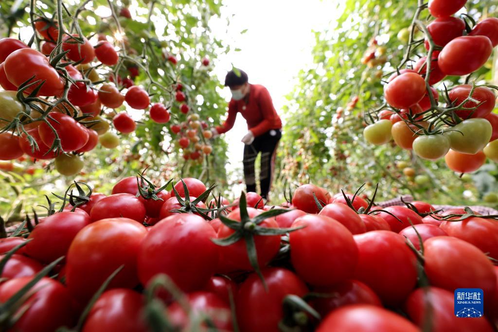 11月7日,山東省棗莊市市中區一合作社的農民在大棚內采摘小西紅柿。