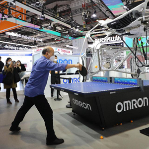 11月6日,參觀(guān)者在第五屆進(jìn)博會(huì )歐姆龍公司展臺與乒乓球機器人互動(dòng)。歐姆龍公司連續參加五屆進(jìn)博會(huì ),本屆進(jìn)博會(huì )上展出的乒乓球機器人是該系列的第七代產(chǎn)品。