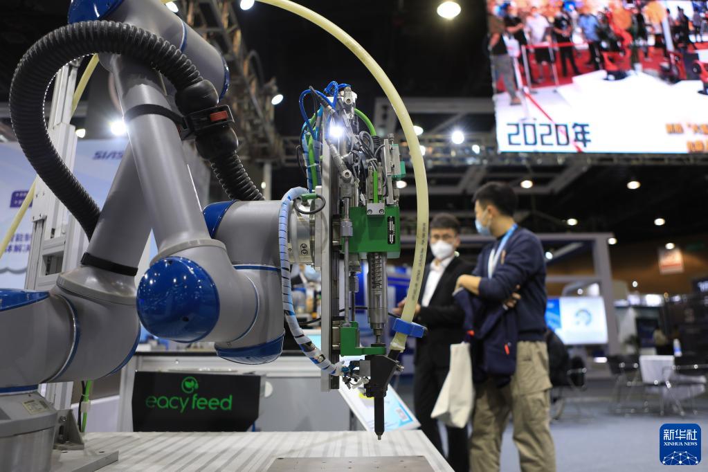 這是11月7日在2022全球工業(yè)互聯(lián)網(wǎng)大會(huì )創(chuàng )新成果展上拍攝的新松協(xié)作機器人。
