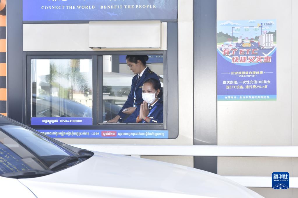 11月7日,工作人員在柬埔寨首都金邊的金港高速公路入口歡迎車(chē)輛駛入。