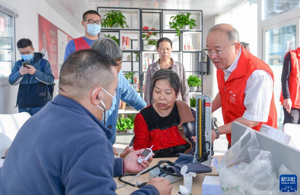 11月8日,在“時(shí)代楷?!卞X(qián)海軍勞模服務(wù)站,錢(qián)海軍(右一)與其他志愿者們一起為社區的老人們安排健康體檢。
