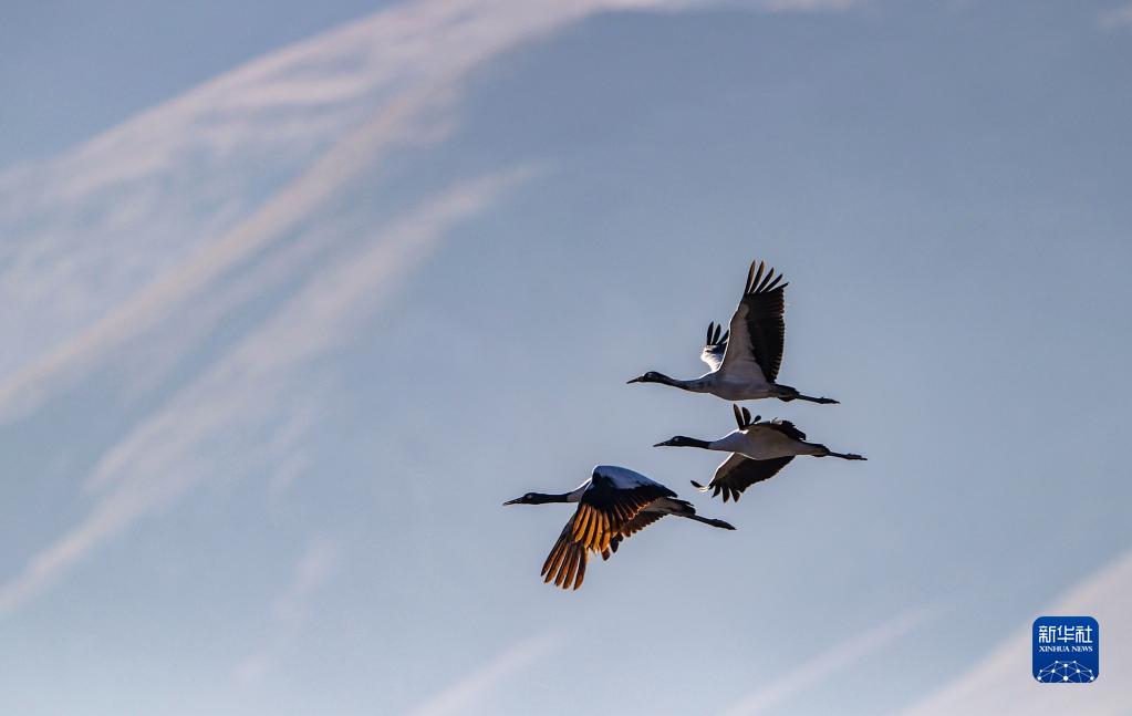 黑頸鶴在林周縣虎頭山水庫上空飛翔(11月6日攝)。