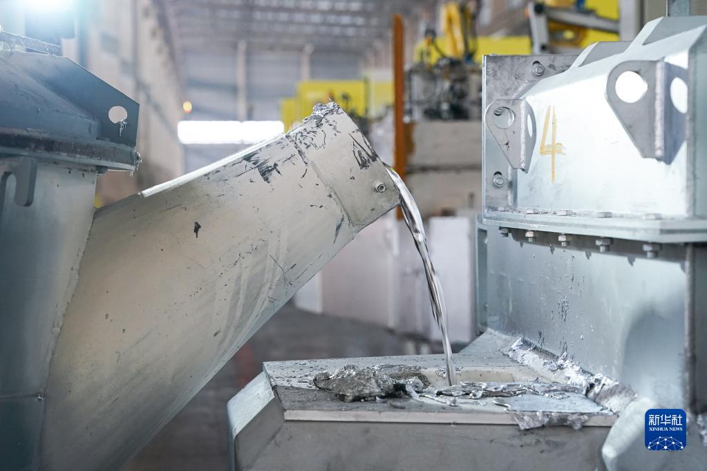 11月7日,在安徽省馬鞍山市含山縣三基輕合金成型科技有限公司,工人操作叉車(chē)向壓鑄機的燃氣保溫爐內添加鋁液。