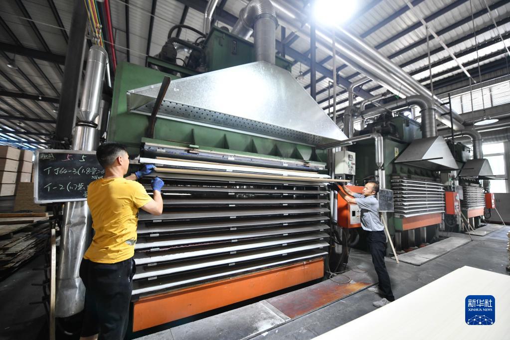 在廣西融水苗族自治縣粵桂協(xié)作產(chǎn)業(yè)園一家林木加工企業(yè),工人在生產(chǎn)線(xiàn)上作業(yè)(2022年5月5日攝)。
