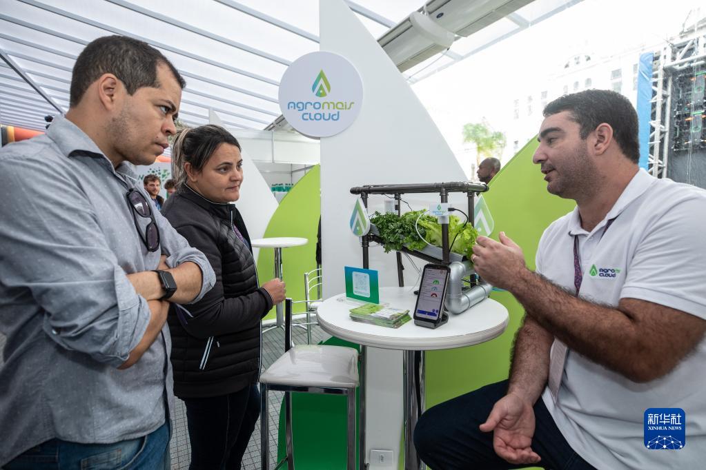 11月8日,在巴西里約熱內盧,工作人員在“里約創(chuàng )新周”上為參觀(guān)者講解一款植物生長(cháng)監測系統。