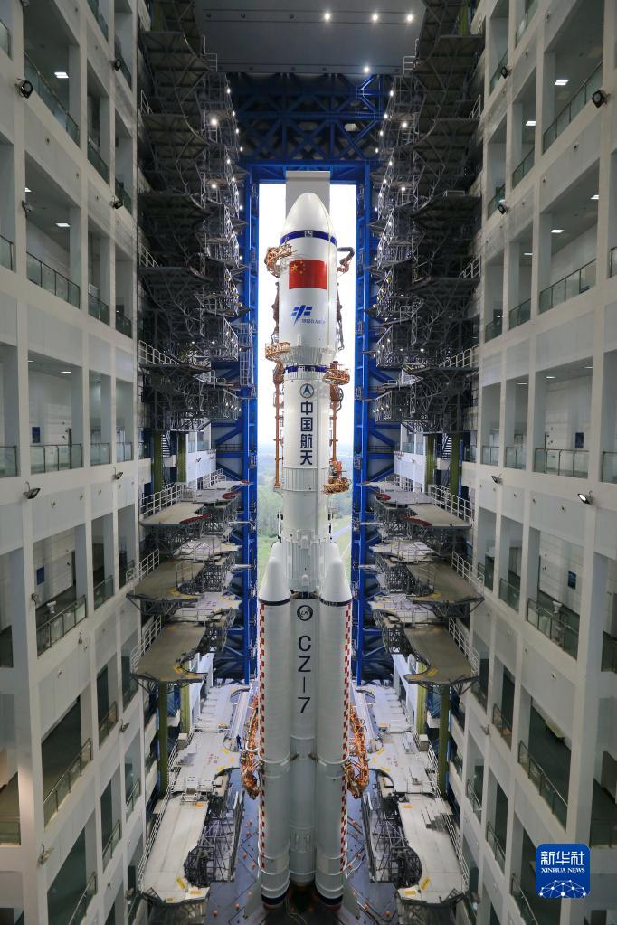 11月9日,天舟五號貨運飛船與長(cháng)征七號遙六運載火箭組合體在進(jìn)行垂直轉運前準備。