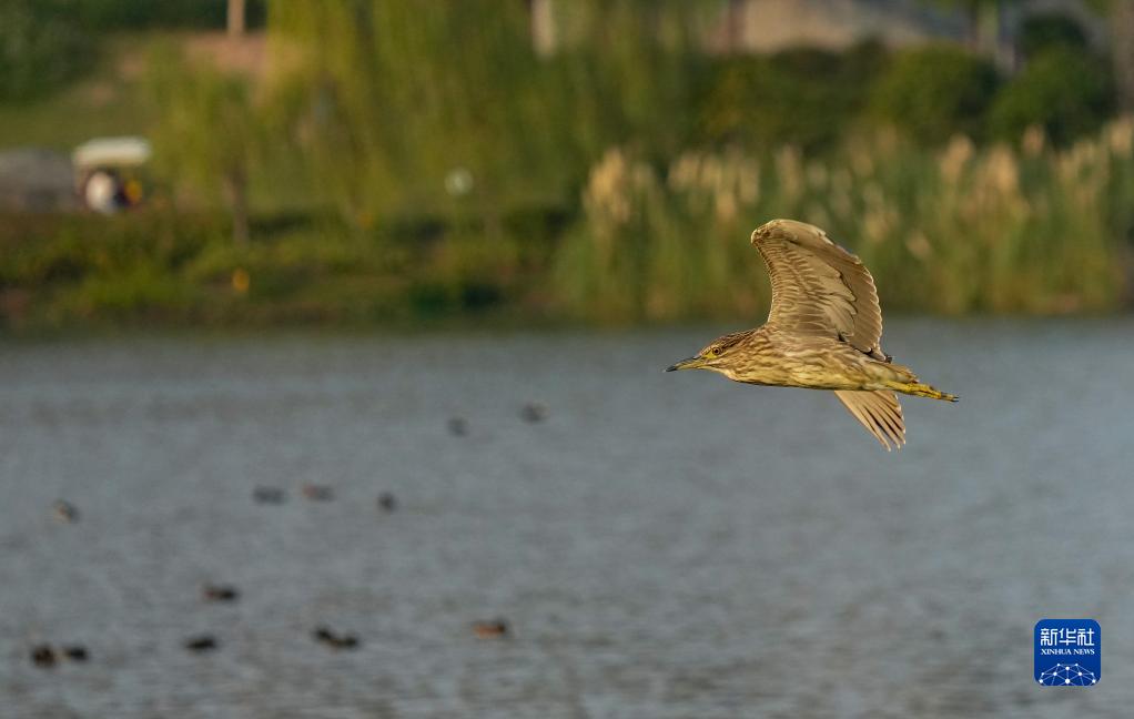 11月7日,在重慶市梁平區雙桂湖國家濕地公園,一只夜鷺在空中飛翔。