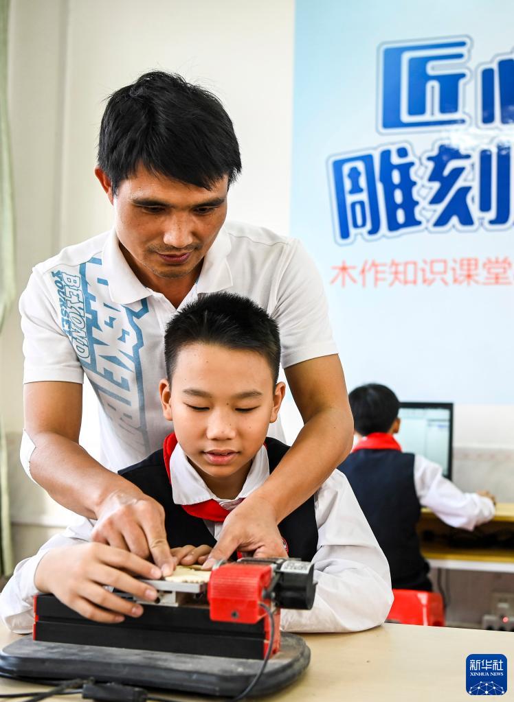 11月9日,在廣西興業(yè)縣石南鎮至德小學(xué),老師教學(xué)生打磨木質(zhì)構件。