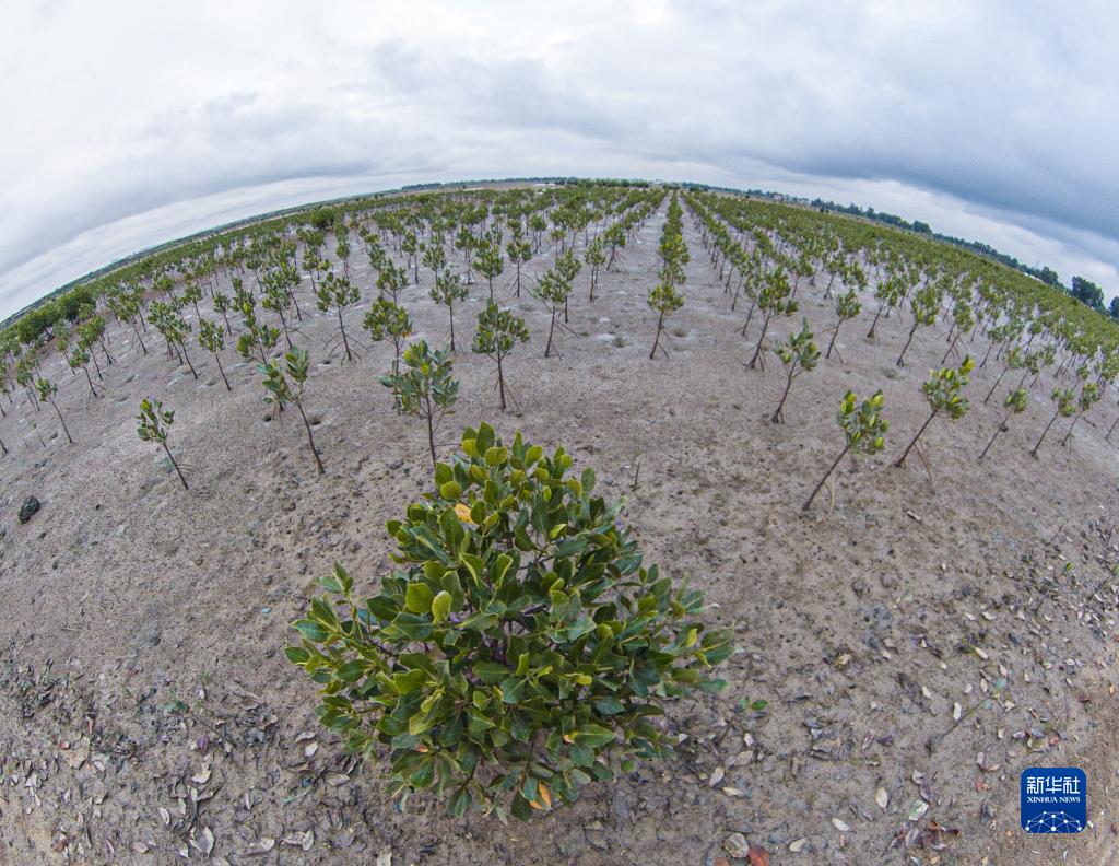 11月8日在海南省儋州市拍攝的新英鹽場(chǎng)紅樹(shù)林恢復造林工程(全景照片)。新華社記者 蒲曉旭 攝