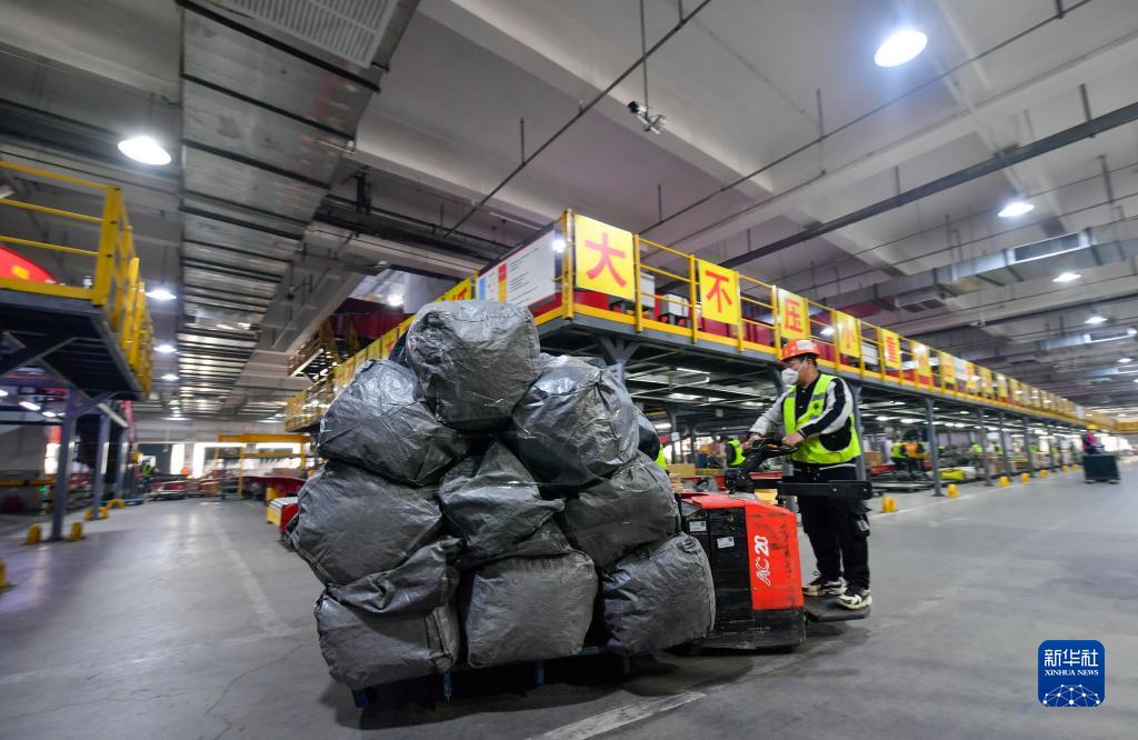 11月9日,在順豐速運天津全自動(dòng)中轉樞紐,工作人員轉運快遞包裹。