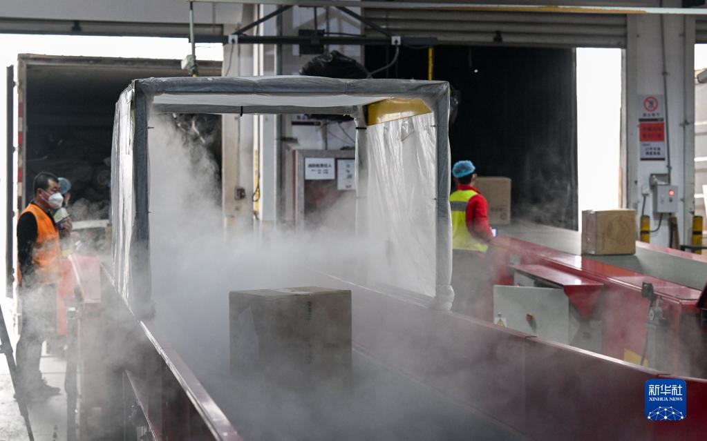 11月9日,在順豐速運天津全自動(dòng)中轉樞紐,機器對進(jìn)入中轉樞紐的快遞包裹進(jìn)行噴霧消殺。