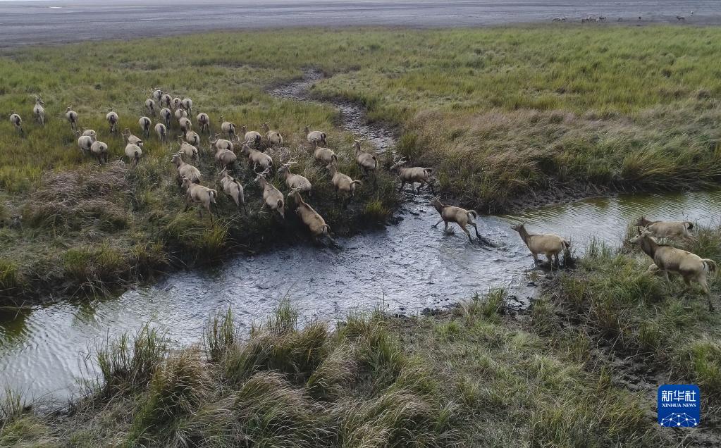 在江蘇大豐麋鹿國家級自然保護區拍攝的麋鹿(2017年11月14日攝,無(wú)人機照片)。