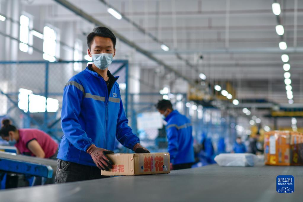 11月10日,工作人員在位于貴州省龍里縣的貴州快遞物流園一家快遞分撥中心分揀快遞。