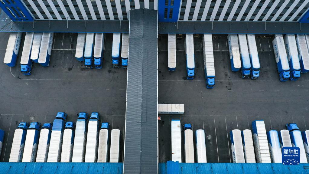 這是11月10日在位于貴州省龍里縣的貴州快遞物流園拍攝的快遞車(chē)輛(無(wú)人機照片)。
