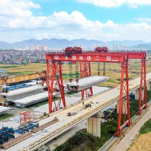 11月10日,南玉鐵路站前工程7標段附近一處制梁場(chǎng)在進(jìn)行箱梁吊裝作業(yè)。