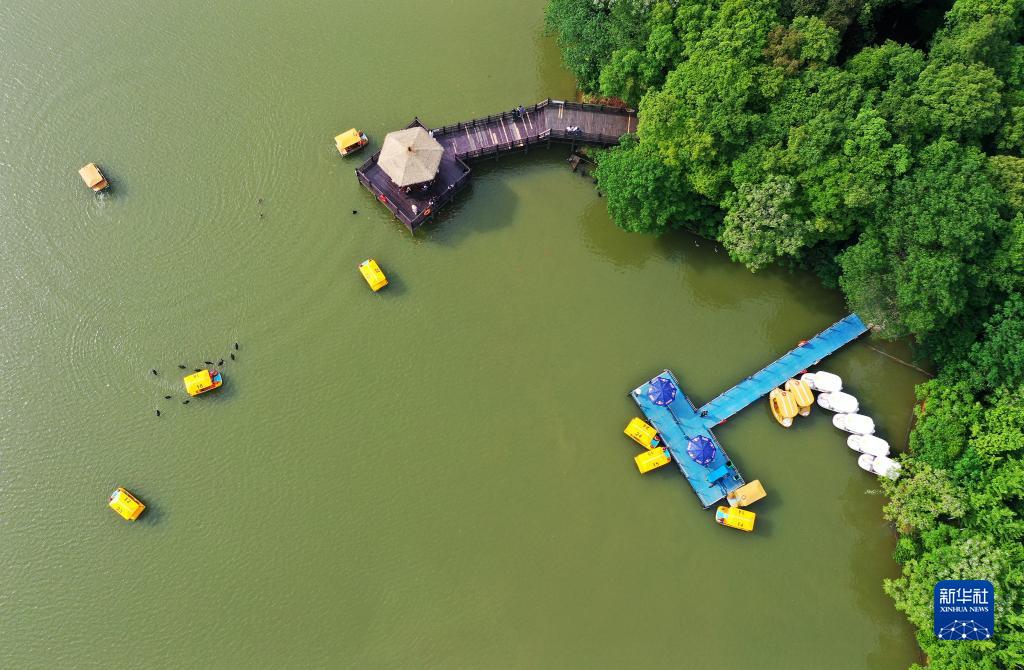 南昌市高新區艾溪湖濕地公園,市民在湖中游玩(2021年5月2日攝,無(wú)人機照片)。