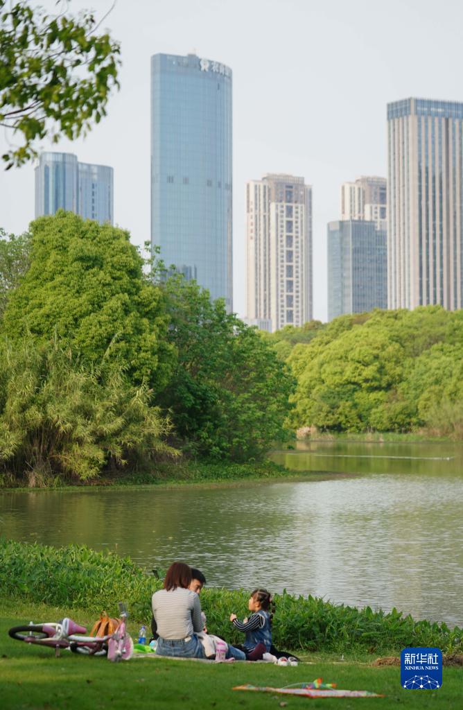 市民在南昌市艾溪湖濕地公園的草地上休憩(2020年4月6日攝)。