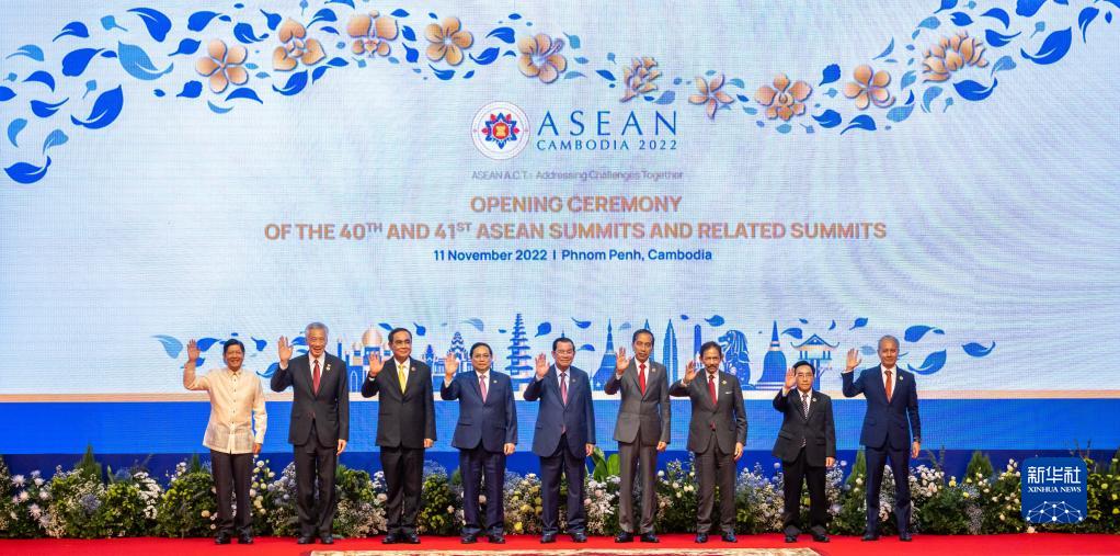 11月11日,在柬埔寨首都金邊,東盟國家領(lǐng)導人在第40屆和第41屆東盟峰會(huì )開(kāi)幕式上合影。