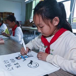 11月11日,嘉興市省身教育集團光明小學(xué)美術(shù)社團學(xué)生在環(huán)保袋上繪制宣傳畫(huà)。