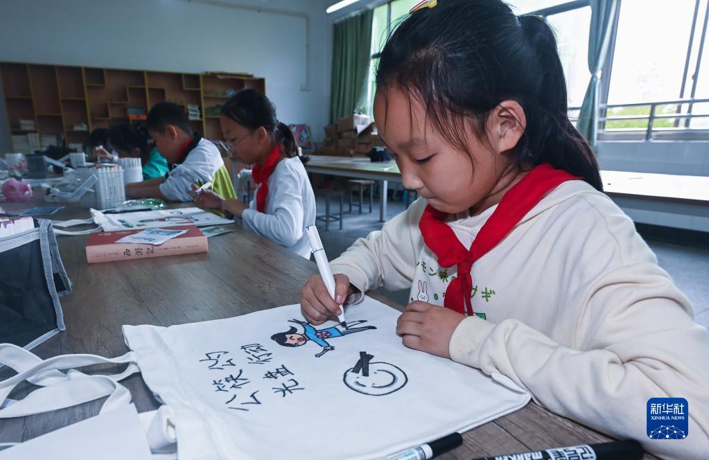11月11日,嘉興市省身教育集團光明小學(xué)美術(shù)社團學(xué)生在環(huán)保袋上繪制宣傳畫(huà)。