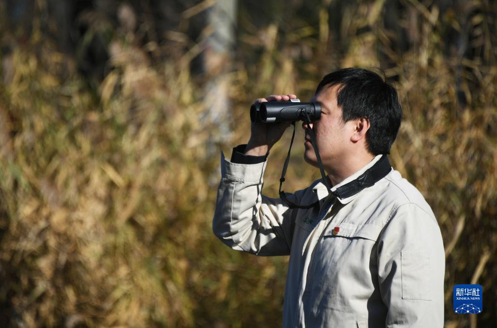 在翠湖國家城市濕地公園,張庚觀(guān)察候鳥(niǎo)棲息的情況(2022年11月7日攝)。