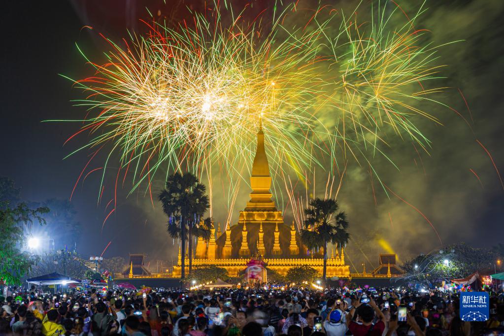 這是11月8日在老撾首都萬(wàn)象拍攝的塔鑾上空的煙花表演。