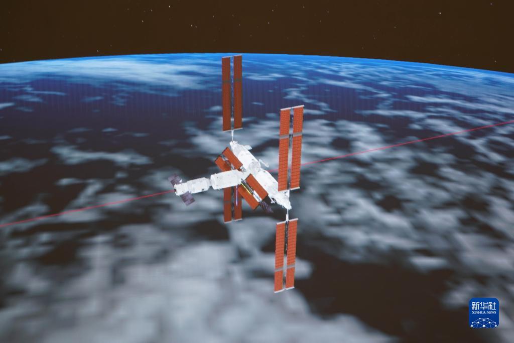 11月12日,在北京航天飛行控制中心拍攝的天舟五號貨運飛船與空間站組合體完成自主快速交會(huì )對接示意圖。