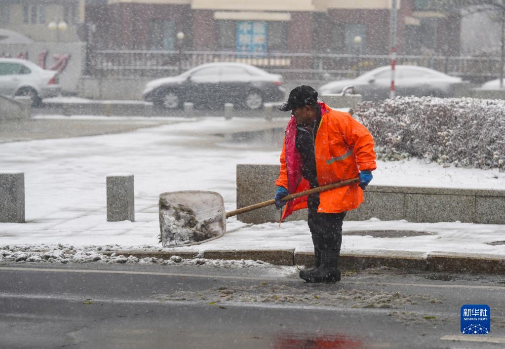 11月12日,在吉林省吉林市,環(huán)衛工人在清理馬路積雪。