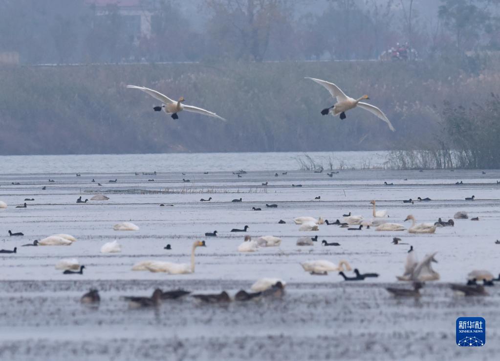 11月11日,天鵝在廬江縣黃陂湖上飛翔。