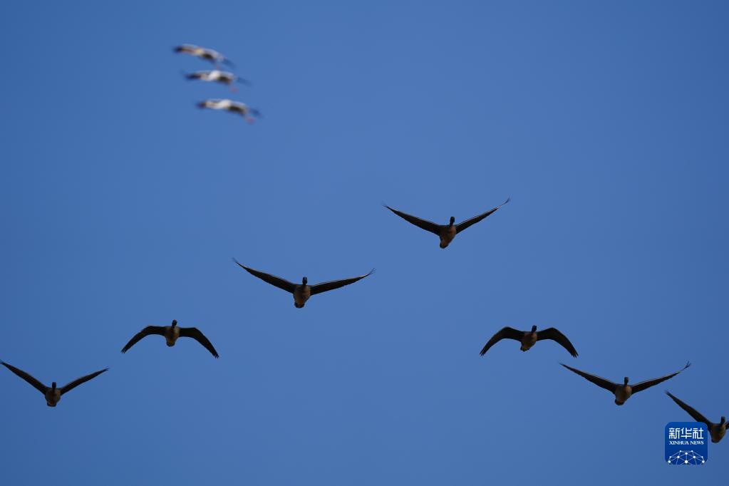 11月10日,豆雁在南昌高新區五星白鶴保護小區飛翔。