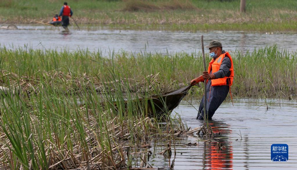 中國野生動(dòng)物保護協(xié)會(huì )的志愿者在位于哈爾濱的松花江濕地巡護時(shí)清理禁用的網(wǎng)具(2021年5月30日攝)。