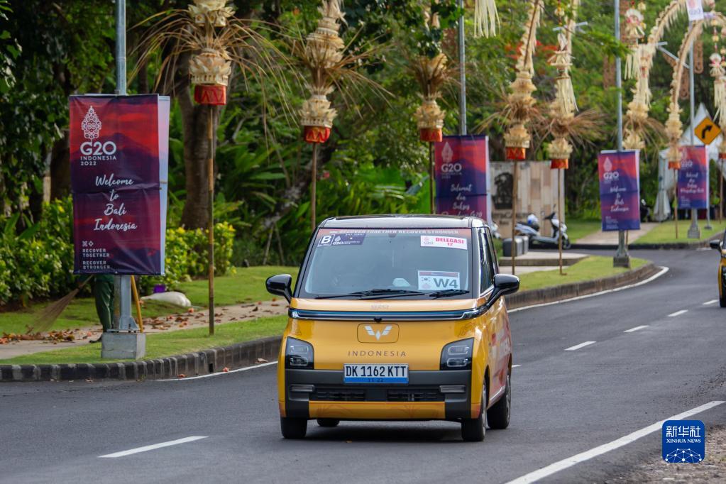 11月12日,峰會(huì )用車(chē)五菱新能源Air ev行駛在印度尼西亞巴厘島的路上。